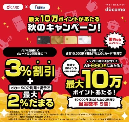 2025年11月1日(土)から11月30日(日)までの期間中、ノジマの店舗でdカードを利用して決済すると、会計金額から3%割引。さらに、同期間中に合計で税込10,000円以上の買い物をdカードで行うと、抽選で最大10万ポイントが進呈されます。