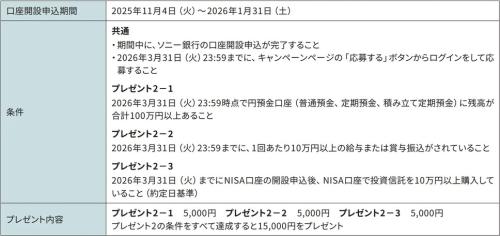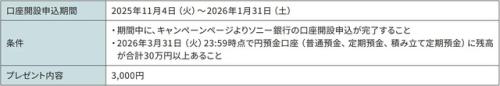 2025年11月4日(火)より開始の「口座開設キャンペーン」は、これからソニー銀行の利用を始める個人に向けた企画です。