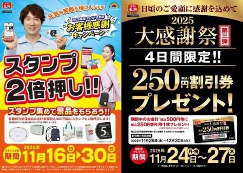 続いて、2025年11月24日(月)から11月27日(木)までの4日間限定で、「大感謝祭」第三弾が開催されます。期間中、各種割引処理後のお会計金額税込500円毎に、「税込250円割引券」1枚プレゼント。この割引券は、次回の会計から利用でき、有効期間は2025年11月28日(金)から12月30日(火)までとなっています。なお、割引券は各店舗でなくなり次第、配布終了です。