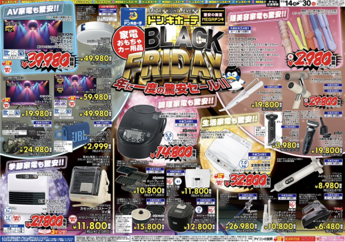 ドン・キホーテでは、11月30日(日)まで「ブラックフライデー」を開催中です。家電・おもちゃ・カー用品など、年末の買い替え需要が高まるアイテムが“驚安”価格で登場。まとめ買いや冬支度にも使いやすいラインアップがそろっています。