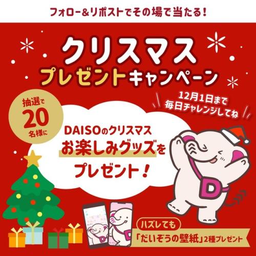 100円ショップ「DAISO(ダイソー)」は、2025年11月17日(月)から12月1日(月)まで、X(旧Twitter)上で「クリスマスプレゼントキャンペーン」を開催します。