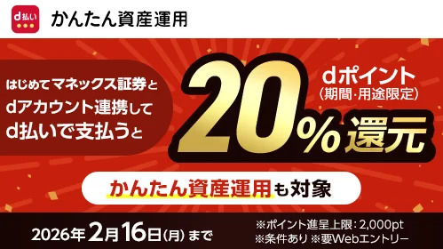 キャンペーン期間中、マネックス証券の証券総合取引口座と「dアカウント」を初めて連携し、所定の条件を満たした利用者に対し、「d払い」での買い物金額の20%にあたるdポイント(期間・用途限定)が還元されます。