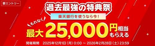 楽天銀行は、個人顧客を対象とした特典進呈額が過去最大となるキャンペーン「過去最強の特典祭」を、2025年12月1日(月)から2026年2月28日(土)までの期間限定で開催することを発表しました。