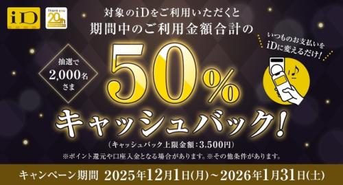 NTTドコモは、同社が提供する電子マネー「iD」が2025年にサービス開始20周年を迎えることを記念し、「iD利用で当たる!50%キャッシュバックキャンペーン」を実施することを発表しました。本キャンペーンは、2025年12月1日(月)から2026年1月31日(土)までの期間、iDを利用した方を対象に、抽選で2,000名に利用金額の50%を還元するものです。