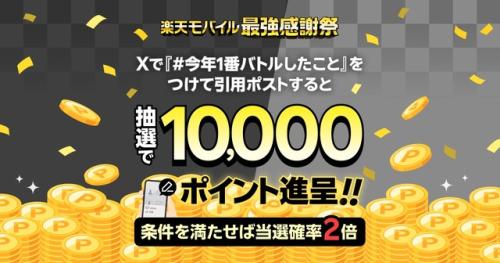 楽天モバイルは、Xでの投稿を対象としたキャンペーン「#今年1番バトルしたこと」を開始します。投稿期間は2025年12月8日(月)10時00分~2025年12月26日(金)09時59分です。抽選で最大50名に楽天ポイント10,000ポイント(期間限定)が進呈されます。