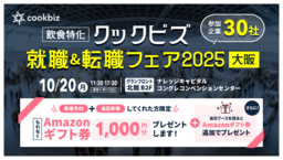 飲食・フード産業に特化した人材サービスを提供するクックビズ株式会社(本社:大阪市北区、代表取締役社長:藪ノ 賢次、以下「当社」)は、2025年10月20日(月)に大阪で初となる「クックビズ 就職&転職フェア2025in大阪」を開催いたします。出展企業のご紹介に加え、各社が展開するブランド名や幅広い募集職種についてもご案内いたします。