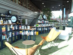 ベンチを組み込んだ壁面本棚や、キューブ型ユニット本棚を設置し、学生の関心に合わせた本や雑誌、コミックを並べることで、気になる一冊と出会うきっかけを作ります。また、オンラインでの双方向イベントにも活用できる98インチの大画面モニターも設置しています。さらに、Wi-Fi・充電スポットを整備し、軽食の持ち込みも可能とすることで、学生が日常的に立ち寄れる場として、多くの利用が期待されます。