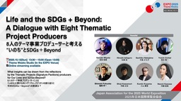 「8人のテーマ事業プロデューサーによる『いのち』に関する各シグニチャーパビリオンの振り返りと将来のSDGs+Beyondへの展望は?」というセントラルクエスチョンを中心に、トークセッションが展開されます。