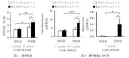 ・高カカオチョコレート摂取群での排便回数は、摂取前の週平均2.8回から摂取後には4.9回に有意に増加しました。また、対照であるホワイトチョコレート摂取群に比べても、摂取後の排便回数は有意に高いことが確認されました(図1参照)。さらに、排便回数だけでなく、排便量においても、同様の結果が得られました。なお、両群ともに試験期間中の体重に有意な変動はありませんでした。