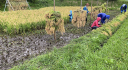 今年5月に開催した「田植え体験イベント」で泥に触れ、植えた苗。その苗がすくすく育ち、9月には黄金色に輝く稲穂へと成長しました。 当日はあいにくの雨模様の下ではありましたが、参加者が鎌を手に一株ずつ丁寧に刈り取り、束ねていく昔ながらの収穫作業を体験しました。特に子どもたちは、初めての田んぼにドキドキしながらも、大人に教わりながら真剣な表情で挑戦し、稲を手にした瞬間には大きな笑顔が広がりました。