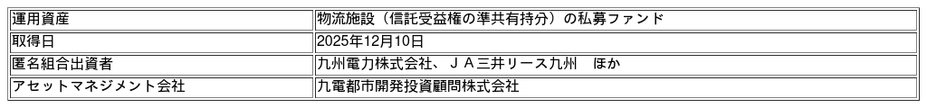 JA三井リース株式会社(本社:東京都中央区、代表取締役 社長執行役員:新分 敬人)の100%子会社であるJA三井リース九州株式会社(本社:福岡県福岡市博多区、代表取締役社長:関 正人、以下、JA三井リース九州)は、九州電力株式会社(本社:福岡県福岡市中央区、代表取締役社長執行役員:西山 勝)の不動産アセットマネジメントの専門子会社である九電都市開発投資顧問株式会社(本社:福岡県福岡市中央区、代表取締役社長執行役員:田原 繁)が組成する不動産ファンド10号案件(以下、本ファンド)に出資いたしましたので、下記の通りお知らせいたします。