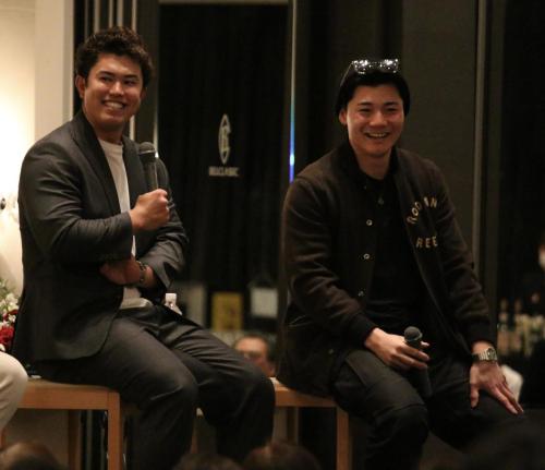 そんな右腕が、心強い味方として加わることになって「だから僕としてはうれしいですね」と大歓迎だ。この日の清宮幸とのトークショーでは「優勝するために、僕とキヨちゃん(清宮幸)とマンチュウ(万波)とジェイ(野村)の『4人で100本』というグループラインがあるんですけど、来年は僕が100本打つんで(笑い)。チームの勝利に貢献出来るようなホームランをたくさん打ちたいです」と宣言。頼もしい新たな仲間を援護するアーチを来季はいっぱい放つ。【木下大輔】