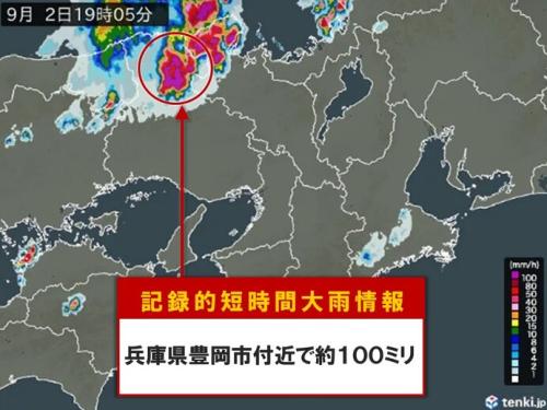 兵庫県豊岡市付近では、2日19時までの1時間に約100ミリの猛烈な雨が降ったとみられ、「記録的短時間大雨情報」が発表されました。