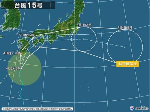 今日4日午前3時に台風15号が奄美大島の東で発生しました。台風15号は今後も北上し、今日4日午後には九州にかなり接近または上陸の恐れがあります。その後、台風は東よりに進路を変えて、5日は四国から関東付近を横断する予想です。