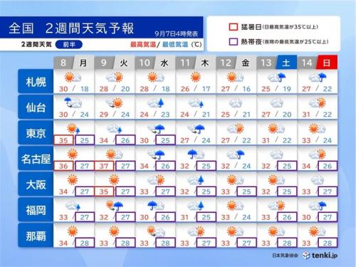 8日(月)~14日(日)までの最高気温は、35℃以上の地点は徐々に少なくなるでしょう。