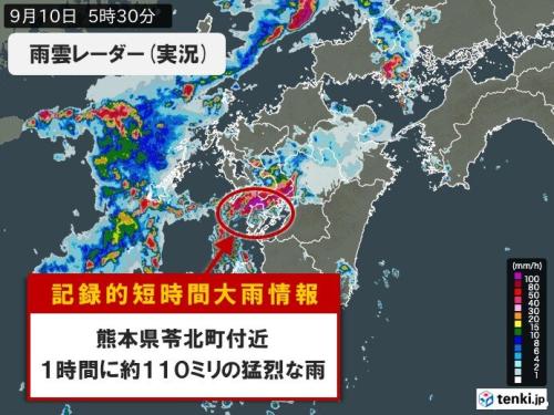 熊本県苓北町付近では、10日5時30分までの1時間に約110ミリの猛烈な雨が降ったとみられ、「記録的短時間大雨情報」が発表されました。