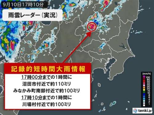 群馬県では局地的に雨雲が発達しています。レーダーの解析で、10日17時までの1時間に群馬県沼田市付近では約110ミリ、群馬県みなかみ町南部付近で約100ミリ、10日17時10分までの1時間に群馬県川場村付近で約100ミリの猛烈な雨が降ったとみられ、「記録的短時間大雨情報」が発表されました。