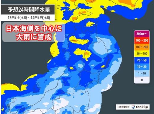 13日(土)から14日(日)にかけて、前線を伴った低気圧が北日本を通過するでしょう。低気圧や前線に向かって南から暖かく湿った空気が流れ込むため、東北日本海側を中心に雨量が多くなり、大雨となる所がありそうです。13日(土)は昼前後を中心に東北南部で雨脚の強まる所があるでしょう。その後、13日(土)夕方から14日(日)朝にかけては、東北北部や日本海側を中心に雨の降り方が強まる予想です。大気の状態が非常に不安定となるため、雷を伴って、1時間に40ミリ以上の激しい雨の降る所もあるでしょう。竜巻などの激しい突風や落雷、ひょうに注意して下さい。また、海上を中心に風が強く、波も高くなるでしょう。強風や高波にも注意が必要です。