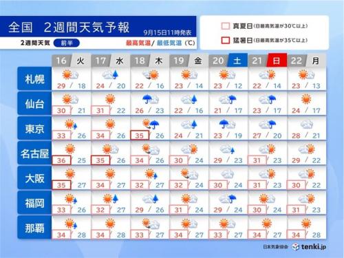 最高気温は期間の前半ほど高く、18日(木)までは九州から関東で35℃以上の猛暑日になる所がありそうです。19日(金)以降は猛烈な暑さが収まり、19日(金)と20日(土)の東京都心は25℃に届かないでしょう。半袖だと肌寒く感じられるかもしれません。九州から東海でも朝晩はしのぎやすくなり、熱帯夜から解放されそうです。