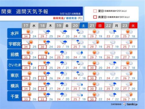 ただ、21日(日)は晴れて、厳しい残暑が戻るでしょう。最高気温が30℃の予想で、再び真夏日になるものの、カラッとした空気に覆われて、比較的、過ごしやすく感じられそうです。