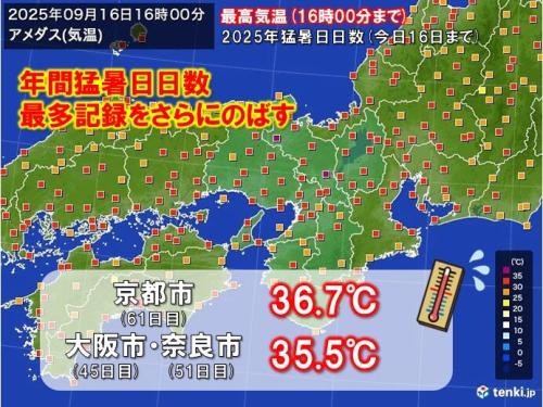 ●今日16日 近畿13か所で猛暑日 大阪・京都など年間猛暑日日数の最多記録のばす