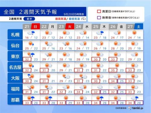 最高気温は、明日21日(日)は、東京、名古屋、大阪、福岡、那覇で32℃前後の予想です。熱中症に警戒が必要です。明後日22日(月)以降は、札幌と仙台では23℃~25℃くらいの日が多くなるでしょう。東京は30℃を下回る日が増えそうです。名古屋、大阪、福岡では30℃を超える日が多くある見込みです。特に26日(金)は、名古屋で35℃と9月も終わりに近づても猛暑日の予想です。ただ、最低気温は20℃を下回る日があり、少しずつですが、季節の進みを感じられるでしょう。