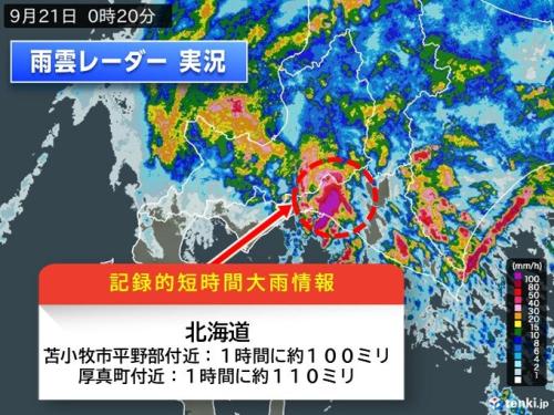 北海道では局地的に雨雲が発達しています。レーダーの解析で、北海道苫小牧市平野部付近では21日0時10分までの1時間に約100ミリ、厚真町付近では21日0時20分までの1時間に約110ミリの猛烈な雨が降ったとみられ、「記録的短時間大雨情報」が発表されました。