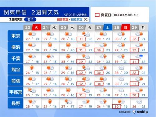 特に26日(金)は、東京で31℃、熊谷・前橋で32℃など、30℃以上の真夏日になる所が多いでしょう。9月も終わりに近づいていますが、まだまだ熱中症にご注意ください。