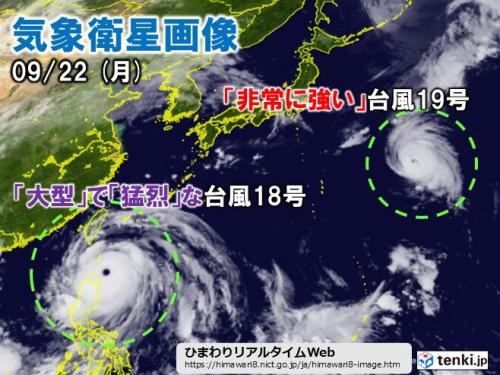 台風18号は、「大型で猛烈な台風」となり、バシー海峡を西へ進んでいます。沖縄では、明日23日(火・祝)にかけて、うねりを伴う高波や強風に注意・警戒が必要です。また、日本の東の海上にある台風19号は、まだこの先の動きが定まっていないため、今後の情報に注意してください。