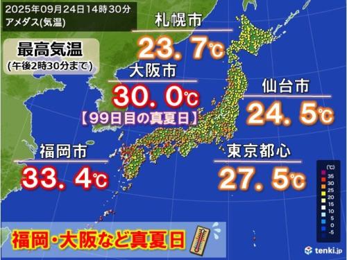 今日24日は、北日本や東日本を中心にさわやかな晴天となっていますが、西日本は雲が多く、太平洋側では雨の降っている所があります。ただ、気温は西ほど高く、福岡市で33℃を超え、大阪市では昨日ようやく途切れた真夏日がまた復活。明日25日、26日と真夏日地点が増加へ。
