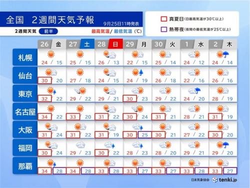 最低気温、最高気温ともに平年より高い傾向が続くでしょう。大阪や名古屋など、日中は30℃くらいまで上がる所がありますが、これまでに比べるとしのぎやすい日が増えてきます。朝晩は東京都心で20℃前後、仙台は15℃くらいまで下がる日もあり、羽織る物が必要になるでしょう。一方、那覇は真夏日と熱帯夜が続くため、熱中症対策を心がけてください。
