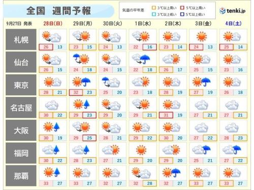 日中の最高気温は、名古屋、大阪、福岡で30℃、鹿児島は31℃、那覇は33℃の予想で、明日28日も厳しい暑さとなる見込みです。東京都心は28℃で汗ばむ暑さとなるでしょう。
