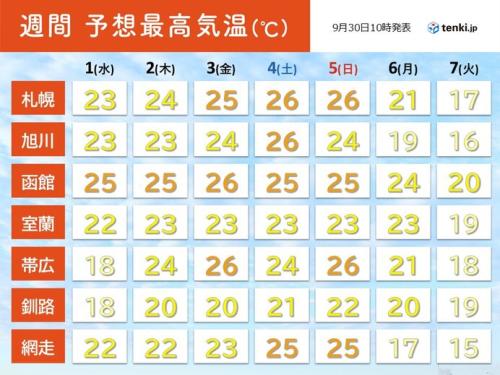 2日(木)から5日(日)にかけては季節外れの暖かさが続きます。内陸を中心に25℃前後まで上がる所が多くなり、10月に入っても夏日となる所があるでしょう。この期間の道内は天気の大きな崩れはなく、日差しのもとでは汗ばむ陽気となりそうです。