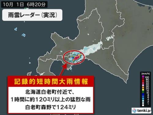 今日1日午前6時20分までの1時間に、北海道白老町付近で約120ミリ以上の猛烈な雨が降ったとみられ、白老町森野では124ミリの猛烈な雨を観測。「記録的短時間大雨情報」が発表されました。