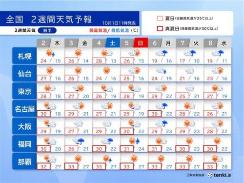 最高気温は平年並みか高い日が多く、沖縄は連日30℃超えの真夏日となるでしょう。九州から東海は30℃以上の日もあり、昼間は残暑が続きます。5日(日)と6日(月)は曇りや雨でも30℃くらいまで上がり、蒸し暑さが増すでしょう。関東は28℃前後まで上がる日が多く、明日2日(木)は汗ばむ陽気が戻りそうです。東北と北海道は、6日(月)の雨を境に気温が下がるでしょう。