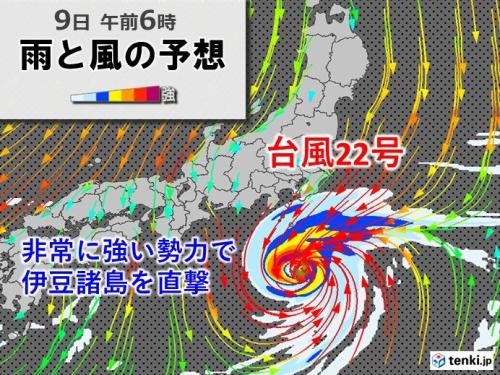 伊豆諸島では、今日8日の夜遅くから非常に強い風が吹くでしょう。明日9日は、一部の住家が倒壊するおそれもある猛烈な風が吹く見込みです。関東地方の海上では明日9日は非常に強い風が吹くでしょう。