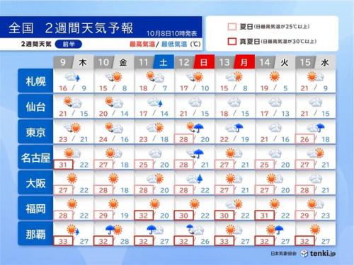 最高気温は、東海から九州を中心に30℃前後まで上がる日が続くでしょう。関東は12日(日)頃には再び真夏日になる所がありそうです。北海道は明日9日(木)以降はこの時期らしい気温になるでしょう。朝晩は10℃を下回る日が多くなりますので、服装にお気をつけください。