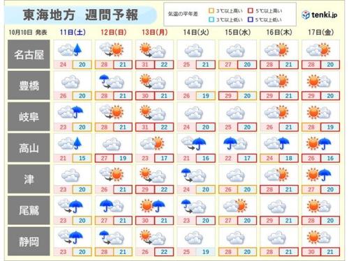 13日(月・祝)は、台風は東へ離れていくため、晴れ間が戻る所が多いでしょう。ただ、湿った空気や気圧の谷の影響が残るため、愛知県東部や静岡県では、午後は曇りや雨となる見込みです。名古屋や岐阜などでは、再び30℃以上の真夏日となるでしょう。季節外れの暑さとなるため、熱中症に気をつけてお過ごしください。