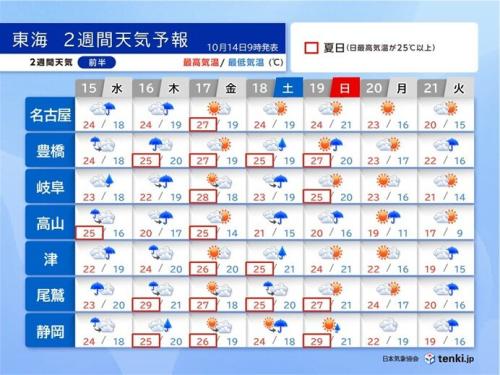 東海地方は、今週はたびたび雨が降るでしょう。17日(金)は、貴重な晴れ間となりそうです。また、これまで続いていた暑さに、ようやく終わりが見えてきました。土日の雨を境に気温が下がり、この時期らしい爽やかな陽気の日が多くなりそうです。秋物のアウターや厚手の布団の準備は、早めに進めておきましょう。