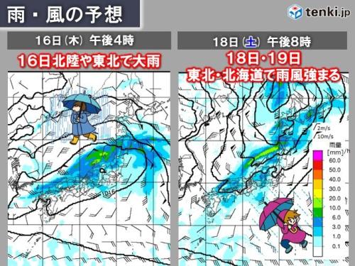 特に、低気圧が近づく北陸や東北では16日(木)は断続的に雨が続き、まとまった雨になりそうです。場合によっては警報級の大雨となる恐れがあります。雨が降ると気温も下がりやすい時期です。雨具に加えて、上着なども準備しておきましょう。