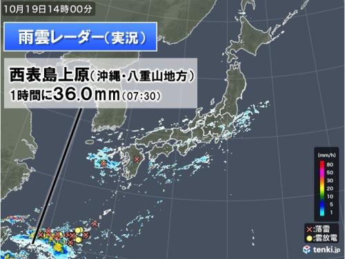 また、フィリピン付近を台風24号が北西に進んでおり、台風周辺の湿った空気が沖縄付近に流れ込んでいます。沖縄本島や先島諸島周辺では活発な雨雲が発生し、雨脚が強まっている所があります。西表島上原(沖縄・八重山地方)では、午前7時30分までの1時間に36.0ミリの激しい雨を観測しました。