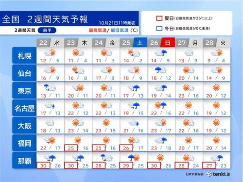 この一週間の最高気温は、22日(水)は平年を下回り、東京都心は13℃と12月上旬並みで、今シーズン一番の寒さとなりそうです。23日(木)以降も平年よりは低いものの、27日(月)には平年を上回るでしょう。10月23日は二十四節気の霜降(そうこう)です。朝の冷え込みで霜が降りはじめる頃とされていますが、札幌では暦通り、朝の最低気温が3℃前後の日が多く、霜が降りるほど冷え込みそうです。各地でグッと冷えたり、寒暖差が大きくなりますので、体調管理にご注意ください。