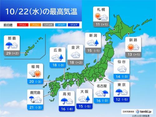 最高気温は北海道から九州まで平年より大幅に低く、昨日21日よりも低くなる所が多いでしょう。札幌は11℃、仙台は14℃、東京都心は12℃の予想です。東京都心は昨日21日よりも5℃も低く、12℃と12月中旬並みで、今シーズン一番の寒さとなるでしょう。今日は冬物のコートが必要なほどになりそうです。名古屋と高知は16℃、大阪は15℃と11月下旬並みの予想です。福岡や鹿児島は20℃くらいまで上がりますが、それでも平年を下回るでしょう。一方、那覇は29℃の予想で、平年より高いでしょう。