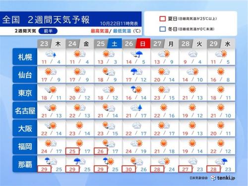 最高気温は平年並みか平年より高い日が多いでしょう。日中は極端な寒さはなさそうです。関東から九州も朝晩は15℃を下回る日が多く、ヒンヤリしますので、お出かけの際の服装にお気をつけください。