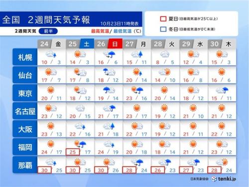 今日23日~明日24日は広く晴れて、日中は快適な陽気となる所が多いでしょう。一方、25日(土)~26日(日)は低気圧や前線の影響で北海道~九州の広い範囲で雨が降りそうです。特に低気圧が発達する26日(日)は北日本で雨や風が強まる可能性があります。