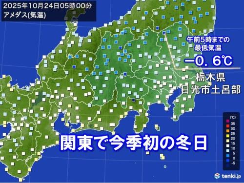 今日24日、栃木県日光市土呂部では、午前3時50分頃に気温が0度を下回り、関東で今季初めて冬日になりました。