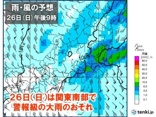 明後日26日(日)は、日本海と本州の南にある2つの低気圧が、前線を伴ってそれぞれ北東へ進むでしょう。関東地方は一日を通して、雨が降り続く見込みです。低気圧に向かって流れ込む湿った空気の影響で、大気の状態が不安定となり、局地的に雨雲が発達するでしょう。神奈川県や千葉県など沿岸部では、24時間降水量が100ミリを超える所があり、警報級の大雨になる恐れがあります。また、風も強めに吹くでしょう。土砂災害や低い土地の浸水、河川の増水に注意・警戒してください。土日に外出を予定されている方は、最新の天気予報や交通情報をこまめに確認するようにしましょう。