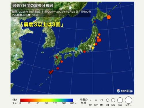 ここ1週間(10月18日11時00分~25日11時00分)では、震度1以上の地震を31回観測しました。
