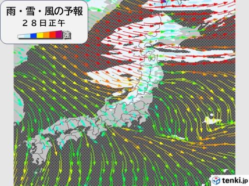 今日28日(火)は、日本海側を中心に、西または北よりの風が強いでしょう。特に、北海道では非常に強い風が吹くため、夕方にかけて暴風に警戒が必要です。