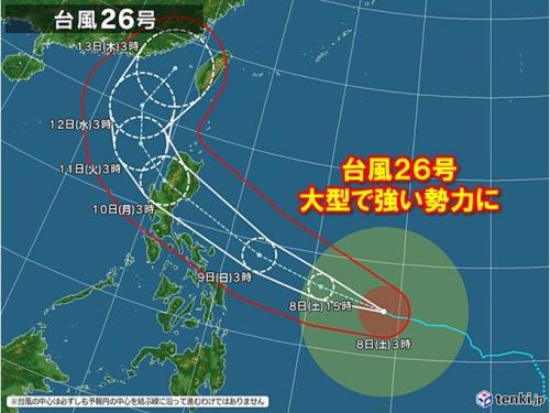 台風26号は今日8日午前3時に「大型」で「強い」勢力に発達しました。週明けにも進路を北よりに変える見込みで、沖縄は警報級の大雨や高波の可能性があります。今後の進路に注意が必要です。